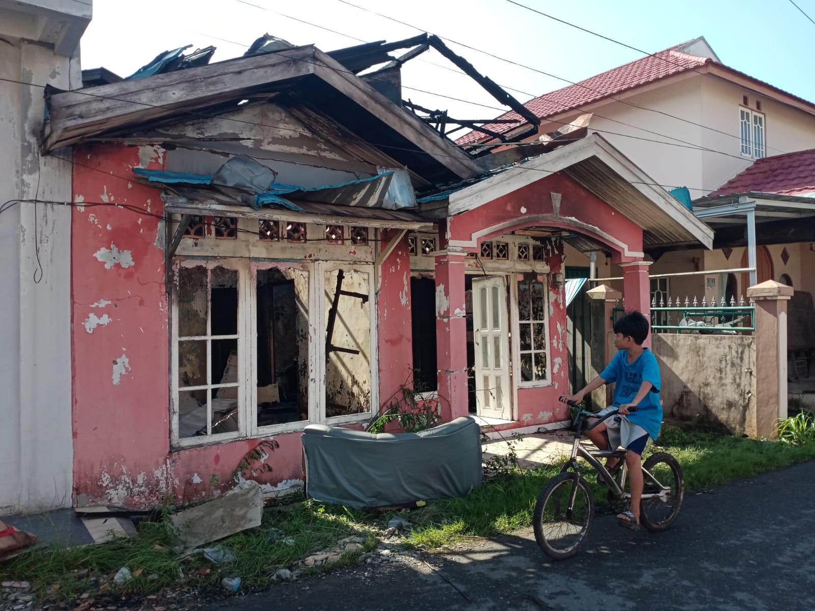 Terlihat bagian atap rumah yang dicat pink itu hancur tak berbentuk setelah dilalap api. Dinding beton sebagian besar juga ikut hangus.