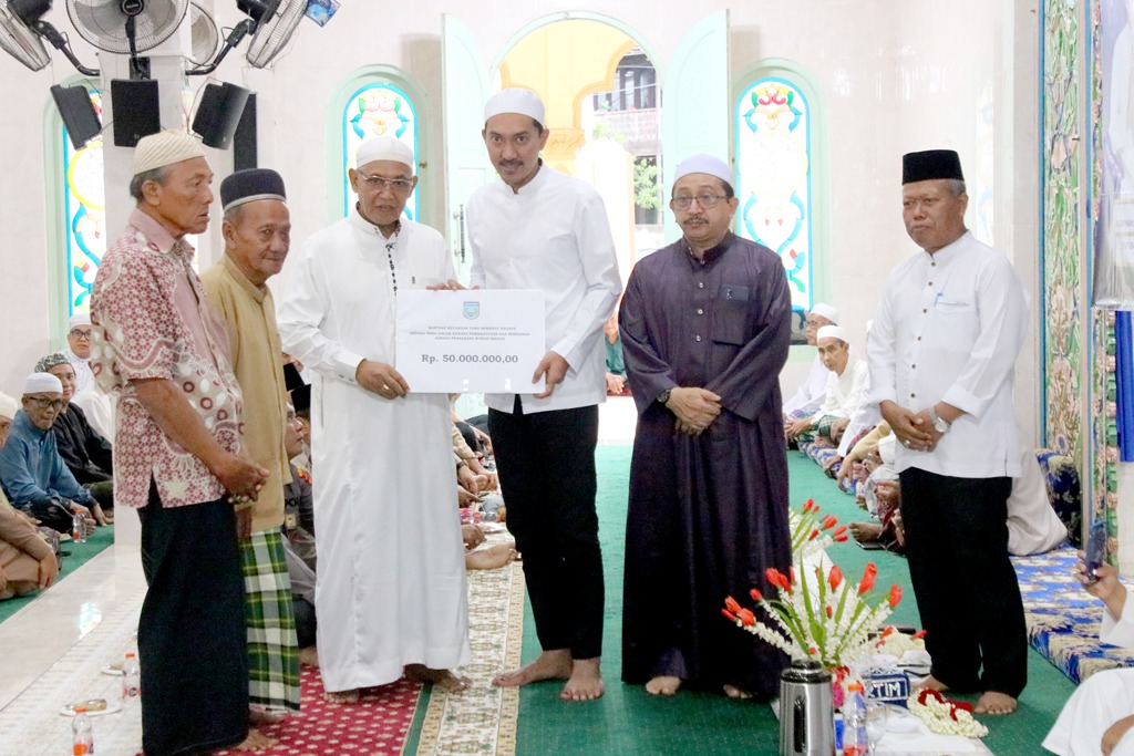 Didampingi Wabup Banjar Habib Idrus Al Habsyi, bupati menyerahkan bantuan Rp 50 juta, keuangan bersifat khusus kepada desa dalam rangka pembangunan dan perbaikan sarana prasarana Masjid Jami.