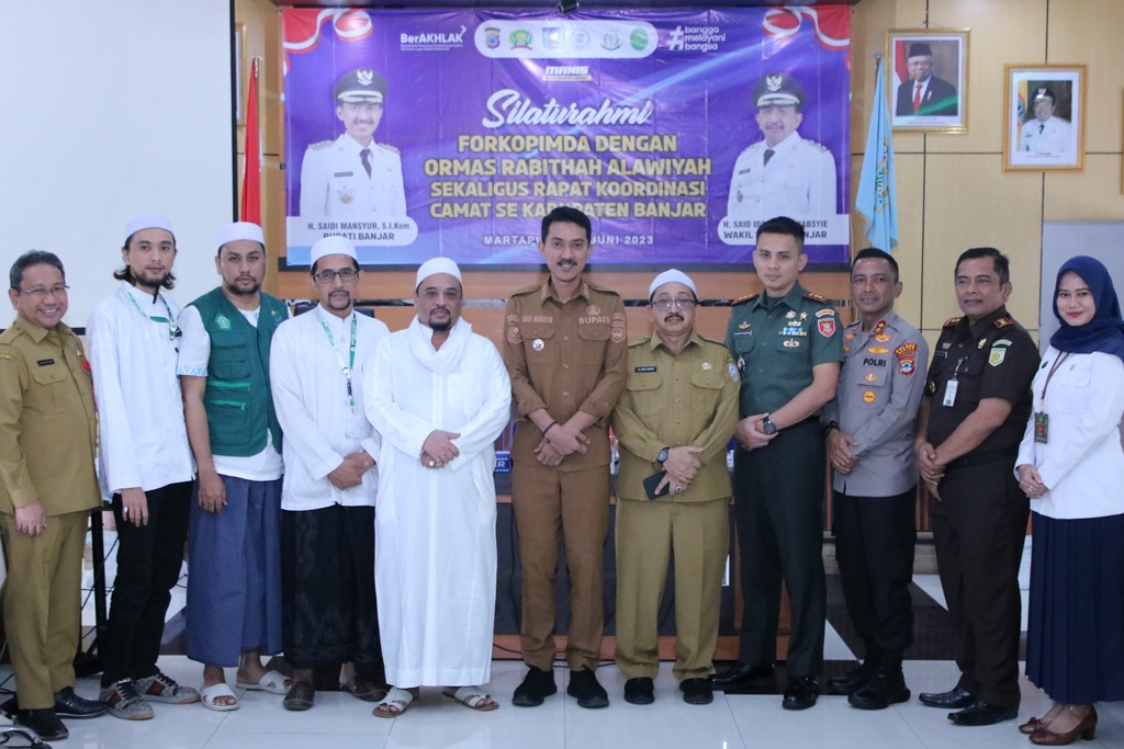 KANALKALIMANTAN.COM, MARTAPURA – Bupati Banjar, H Saidi Mansyur bersama jajaran dan unsur Forkopimda menerima kedatangan Ketua beserta pengurus Rabithah Alawiyah DPC Martapura/Banjarbaru, Senin (26/6/2023) pagi.