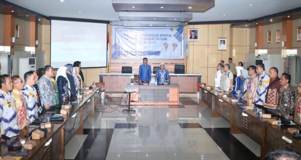 Penyerahan secara simbolis dokumen perjanjian kinerja kepala perangkat daerah tahun 2025 diserahkan kepada Kadinkes Yasna Khairina, Kadisdukcapil Azwar, Camat Martapura Timur Guslan dan Camat Martapura Barat Ahmad Rabani. (kanalkalimantan.com/dkispbanjar/kk)