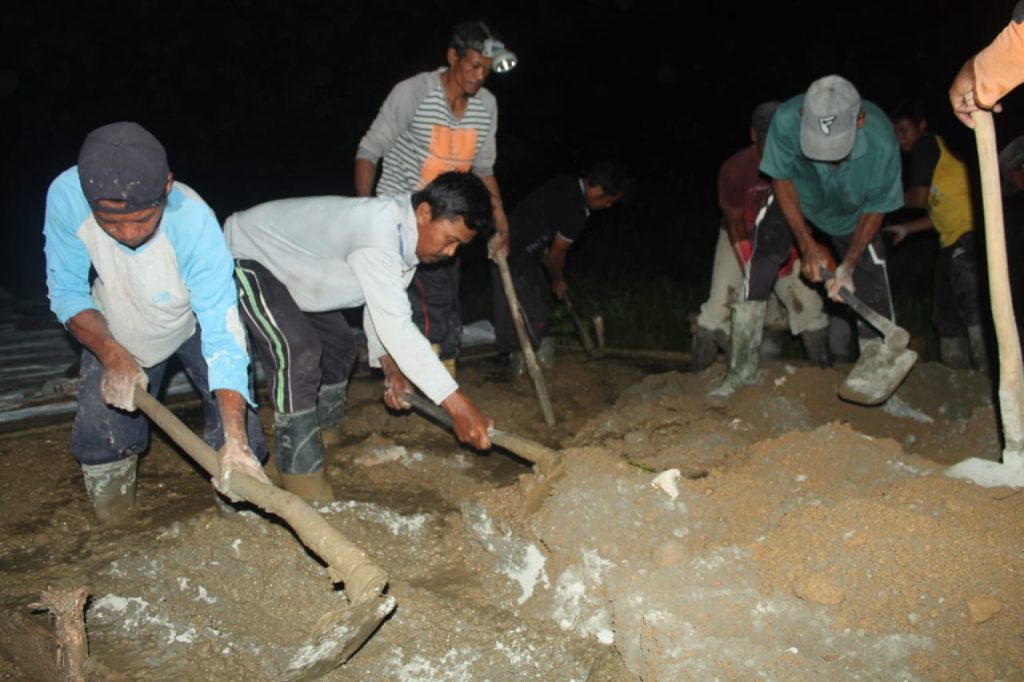 KANALKALIMANTAN.COM, PARINGIN – Bermandi keringat, Satgas TNI Manunggal Membangun Desa (TMMD) Kodim 1001/HSU-BLG bersama warga melakukan pengecoran jalan hingga malam hari di Transmigrasi Lajar Papuyuan, Desa Matang Hanau, Kecamatan Lampihong.