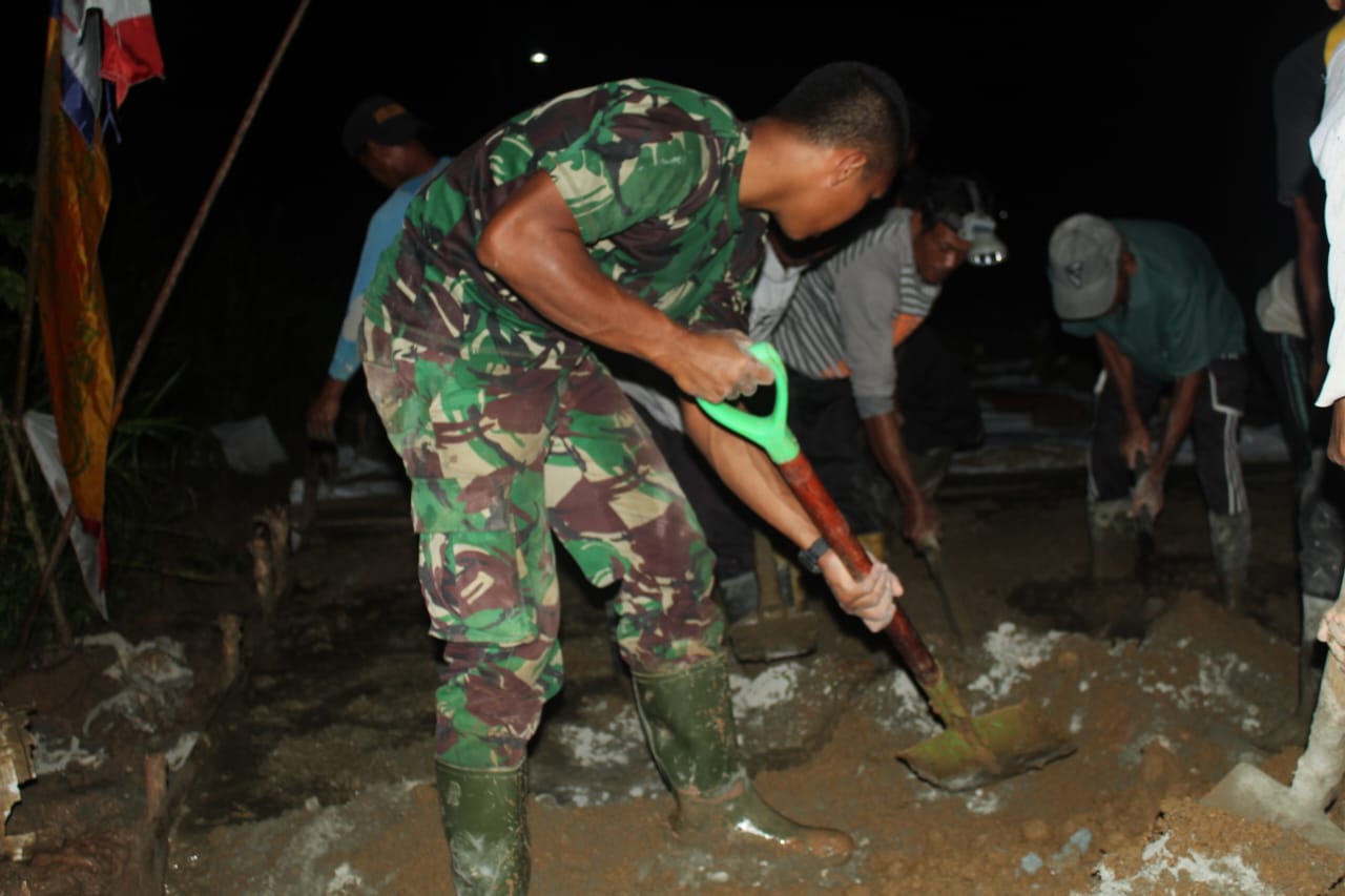 KANALKALIMANTAN.COM, PARINGIN – Bermandi keringat, Satgas TNI Manunggal Membangun Desa (TMMD) Kodim 1001/HSU-BLG bersama warga melakukan pengecoran jalan hingga malam hari di Transmigrasi Lajar Papuyuan, Desa Matang Hanau, Kecamatan Lampihong.