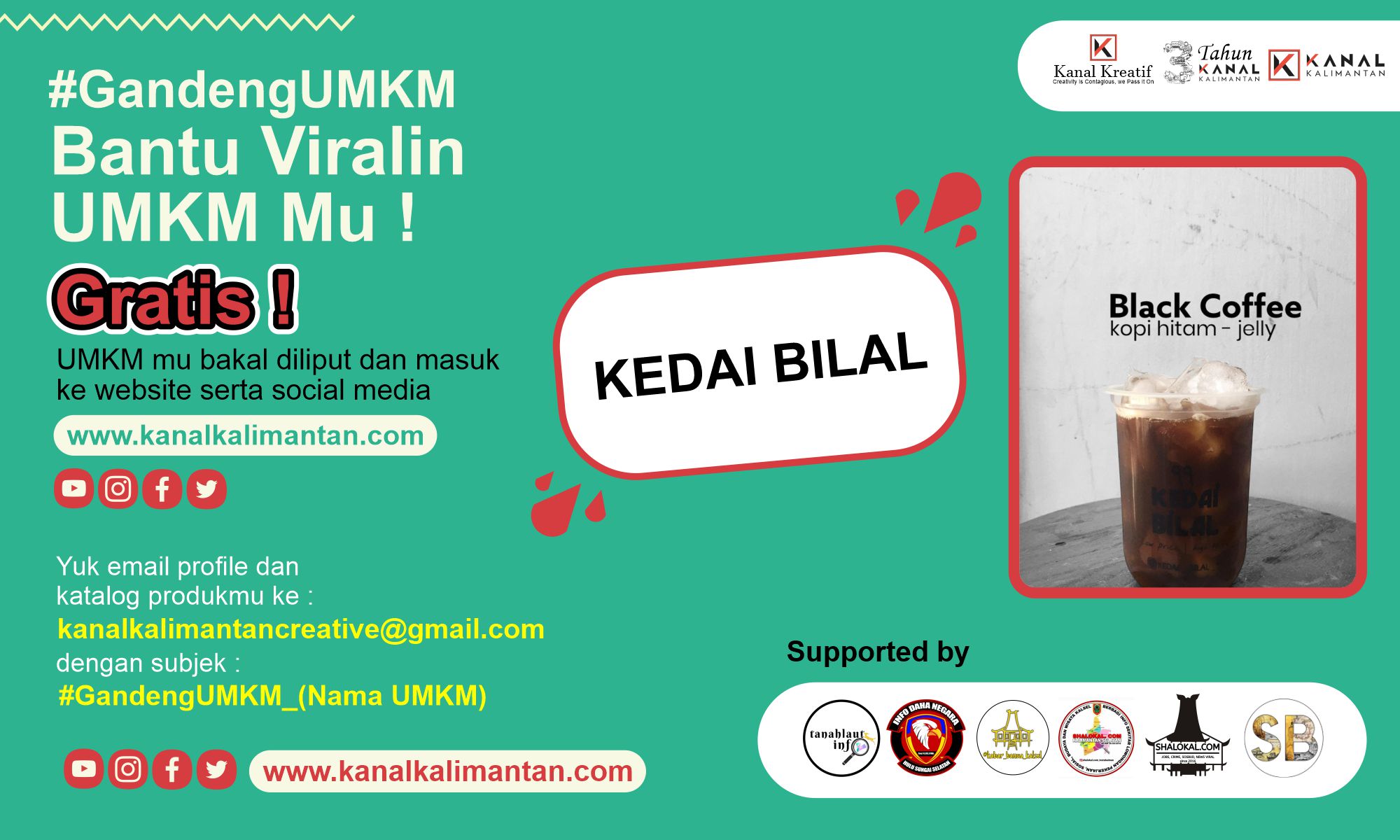 Pada program ini, Kanalkalimantan.com juga mengajak mitra pemilik dan pengelola akun media sosial untuk bersama membantu UMKM. Seperti halnya Shalokal Grup (shalokal,com & @shalokal.com_instabaiman), Kabar Banua Kalsel (@kabar_banua_kalsel), Info Daha Negara (@infodahanegara), Sejarah Banua (@sejarah_banua) dan Tanah Laut Info (@tanahlautinfo).