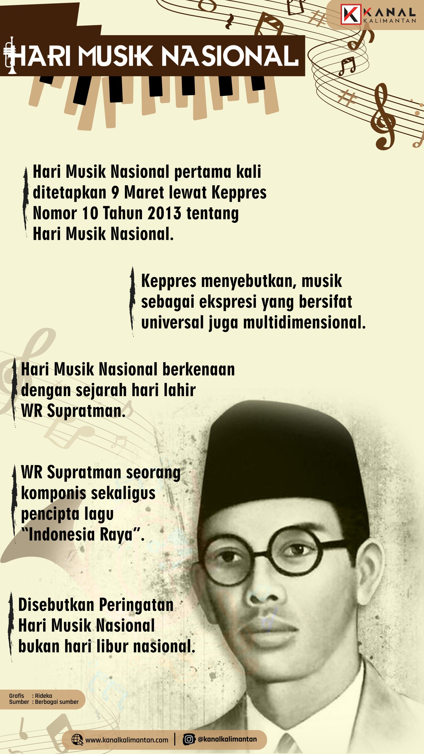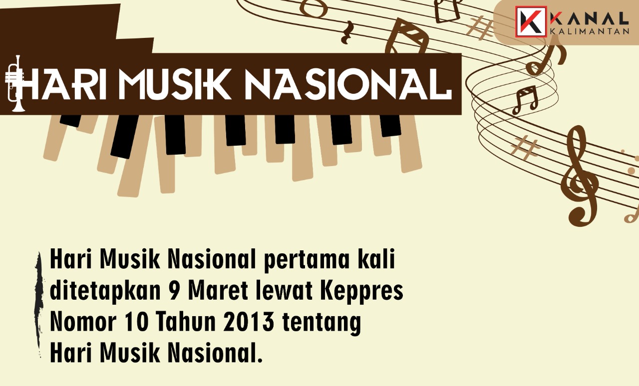KANALKALIMANTAN.COM – Hari Musik Nasional adalah peringatan hari musik di Indonesia yang jatuh pada setiap tanggal 9 Maret, disamakan dengan hari lahir pahlawan nasional Wage Rudolf Soepratman. Peringatan ini, kali pertama dilakukan pada 9 Maret 2013 melalui Keputusan Presiden (Keppres) Nomor 10 Tahun 2013 tentang Hari Musik Nasional. Dalam Keppres itu disebutkan pula bahwa peringatan Hari Musik Nasional bukan hari libur nasional.