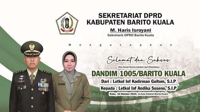 “Kami beserta seluruh staf Sekretariat DPRD Batola mengucapkan selamat bertugas di Batola kepada Letkol Inf Andika Suseno S.I.P yang kini menjabat sebagai Dandim 1005/Batola. Semoga sukses dalam menjalankan tugas dan amanah yang diberikan,” ungkap M Haris Isroyani.