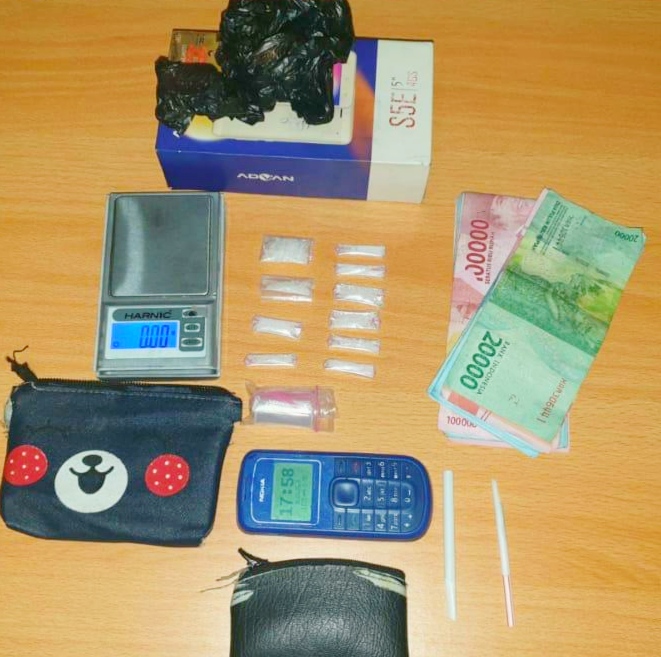 Alhasil ditemukan 10 paket narkotika jenis sabu dengan berat keseluruhan mencapai 3.72 gram dengan berat bersih 1.92 gram. Ditambah lagi dengan barang bukti lainnya seperti buah dompet kecil warna hitam, 2 buah sedotan (sendok), uang tunai sebesar Rp 1.970.000, sebuah timbangan digital dan handphone.