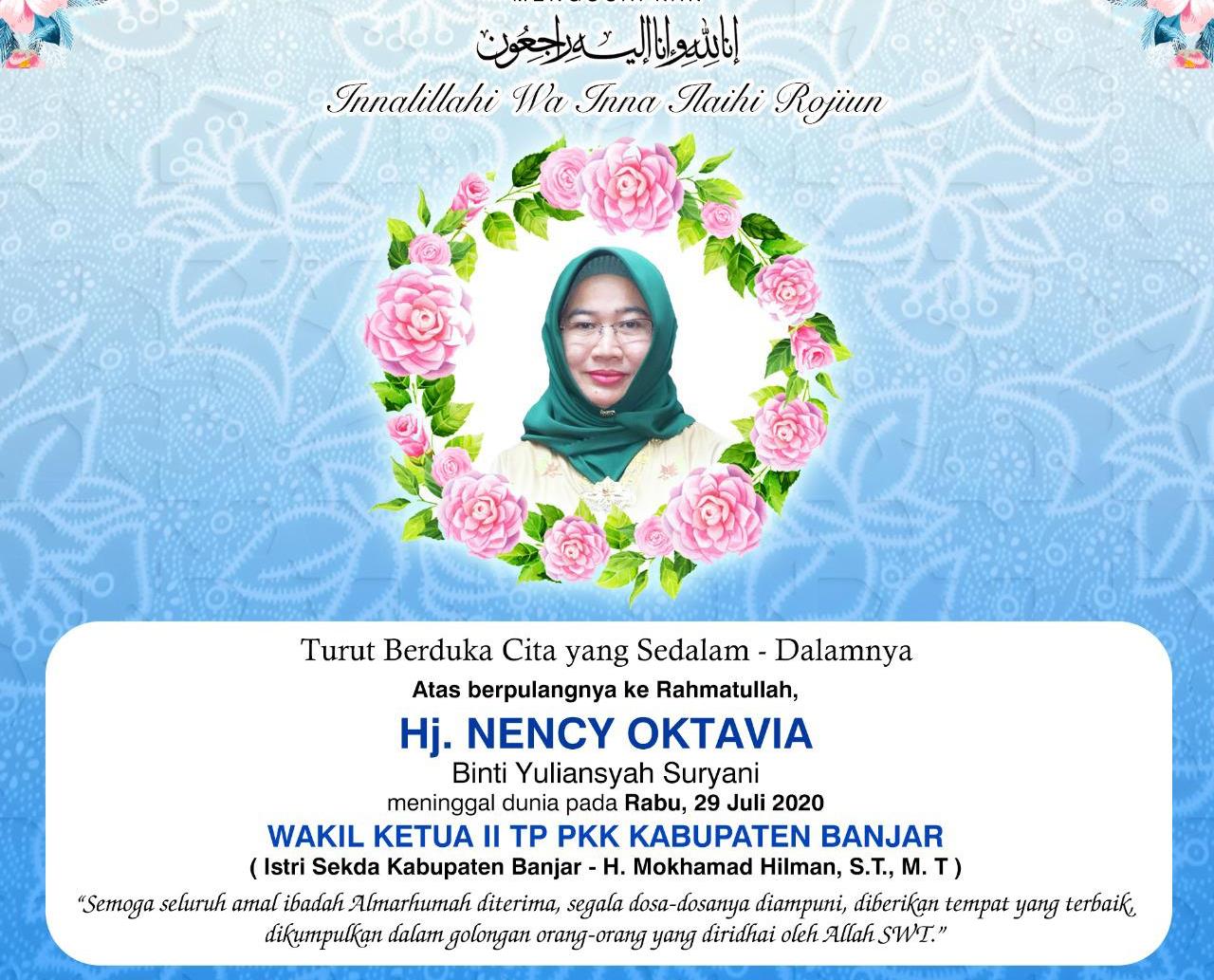 KANALKALIMANTAN.COM, MARTAPURA – Innalillahi Wainna Ilaihi Rajiun. Kabar duka datang dari Sekretaris Daerah Kabupaten Banjar HM Hilman. Sang isteri, Hj Nency Oktavia (46) meninggal dunia pada Rabu (29/07/2020) sekitar pukul 02.15 Wita.