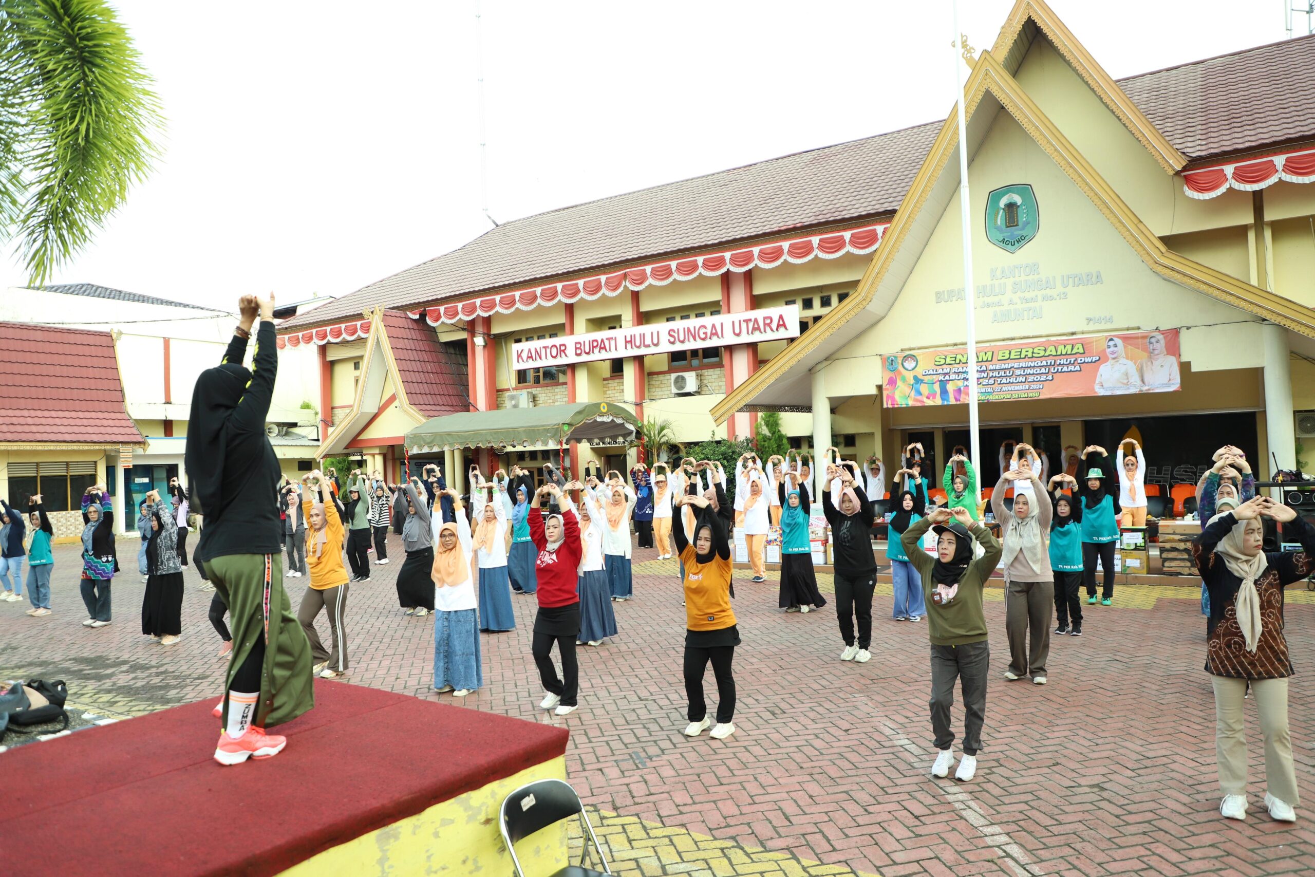 KANALKALIMANTAN.COM, AMUNTAI – Ratusan ASN di lingkungan Pemerintah Kabupaten (Pemkab) Hulu Sungai Utara (HSU) mengikuti senam bersama dalam rangka memeriahkan HUT ke-25 Dharma Wanita Persatuan (DWP) di halaman kantor Bupati HSU, Jumat (22/11/2024) pagi.