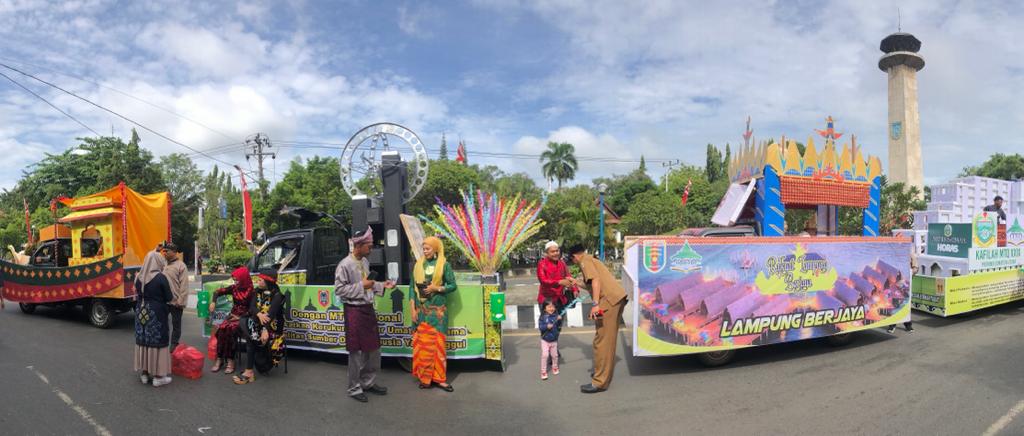Sementara itu, mobil hias Provinsi Kalimantan Selatan, Nanang Galuh menjadi salah satu perwakilan yang turut duduk di atas mobil dengan hiasan Masjid Bambu Kiram.