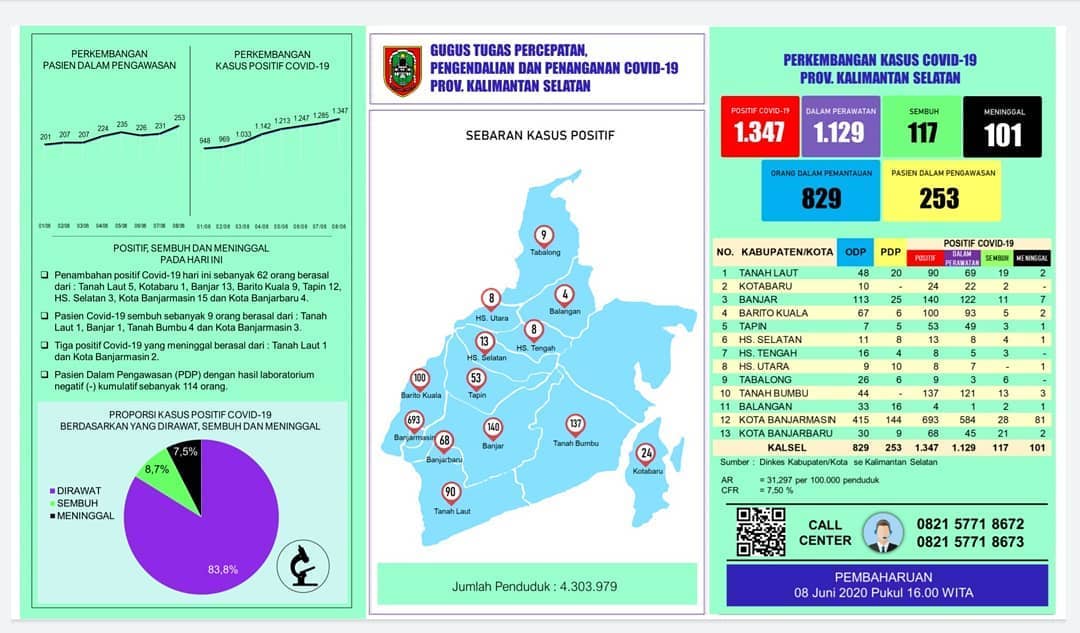 “Penambangan kasus positif Covid-19 hari ini sebanyak 62 kasus,” beber Juru Bicara Tim Gugus Tugas Percepatan Penanganan Covid-19 Kalsel Muhammad Muslim di Banjarbaru, Senin (8/6/2020) sore.