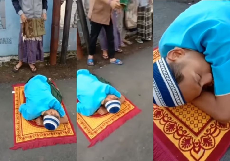 Pada video yang diunggah oleh akun Instagram @underc0ver.id, terlihat seorng pria tersungkur tidur di atas sajadah.