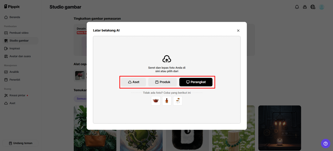 3. Unggah foto dengan memilih Perangkat, menempelkan tautan melalui Produk, atau menggunakan Aset.