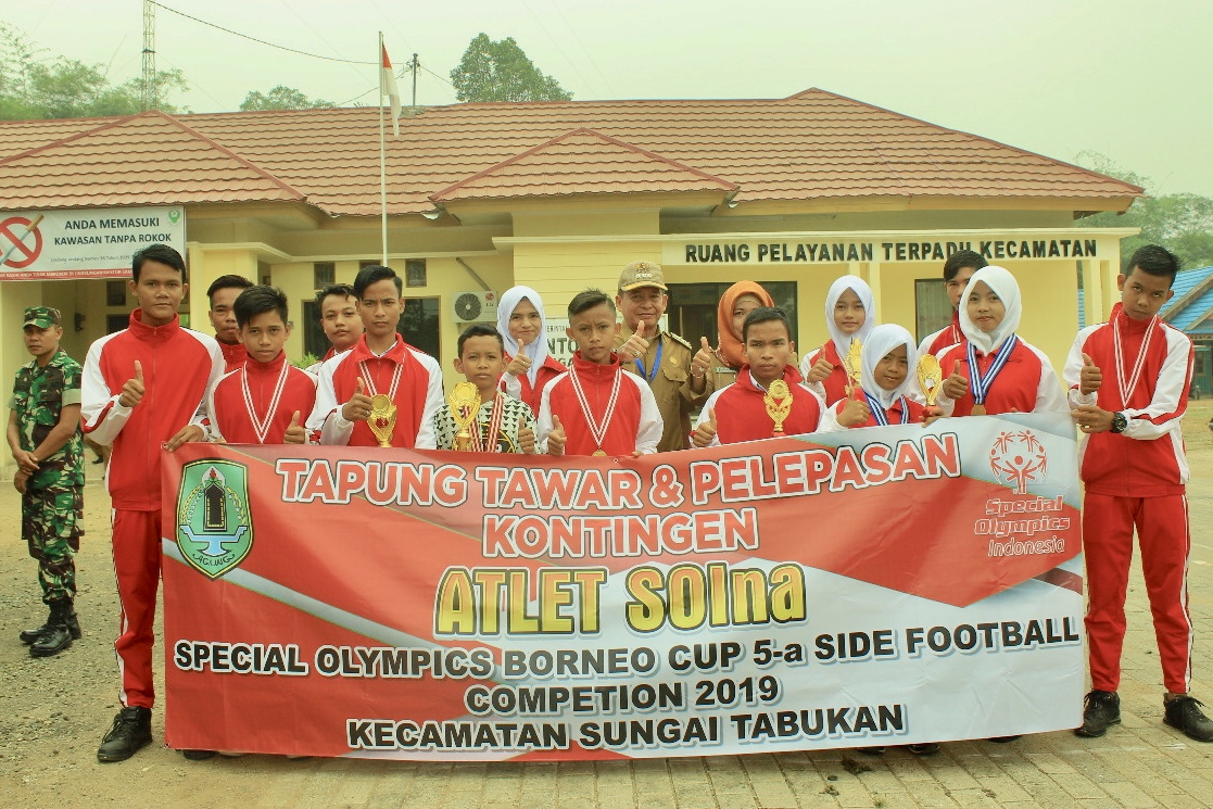 AMUNTAI, Sebanyak 15 atlet SOIna (Spesial Olympics Borneo Cup 5-a Side Football Competition) Kecamatan Sungai Tabukan, Kabupaten Hulu Sungai Utara (HSU) dilepas Camat Sungai Tabukan H Syahbudinnor saat apel pagi Senin (7/10) di halaman kantor kecamatan.
