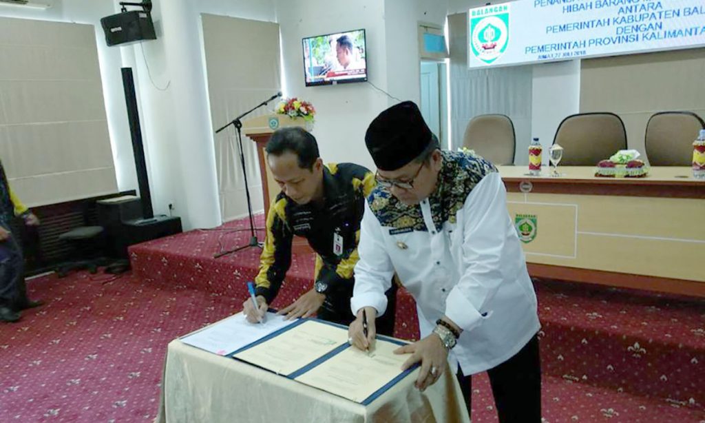 BANJARBARU, Tindak lanjut terkait hibah tanah yang akan diterima KPH Balangan untuk lokasi kantor baru, Bupati Balangan dengan Kadishut Prov Kalsel di Kantor Bupati Balangan melakukan penandatangan berita acara serah terima dengan dihadiri seluruh pejabat esselon Dishut Prov Kalsel dan KPH Balangan serta SKPD Kabupaten Balangan pada Jumat (27/7).