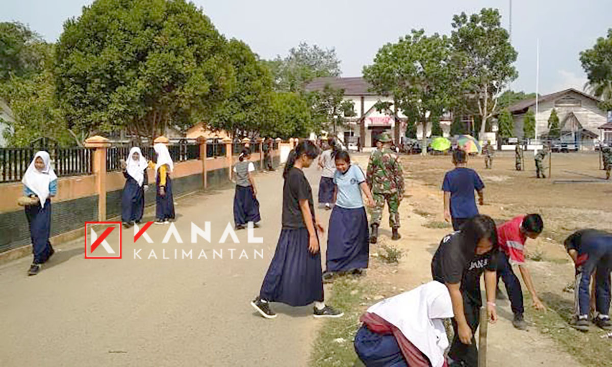 PARINGIN, Puluhan siswa-siswi SD-SMP berpartisipasi membantu membersihkan lapangan untuk persiapan pembukaan Tentara Manunggal Masuk Desa (TMMD) ke-106 di Dusun Libaru Sungkai, Desa Binuang Santang, yang bakal jadi lokasi pembangunan. Para siswa sekolah tampak bersama personel Kodim 1001/Amuntai-Balangan antusias gotong-rotong membersihkan rumput, Senin (30/9).