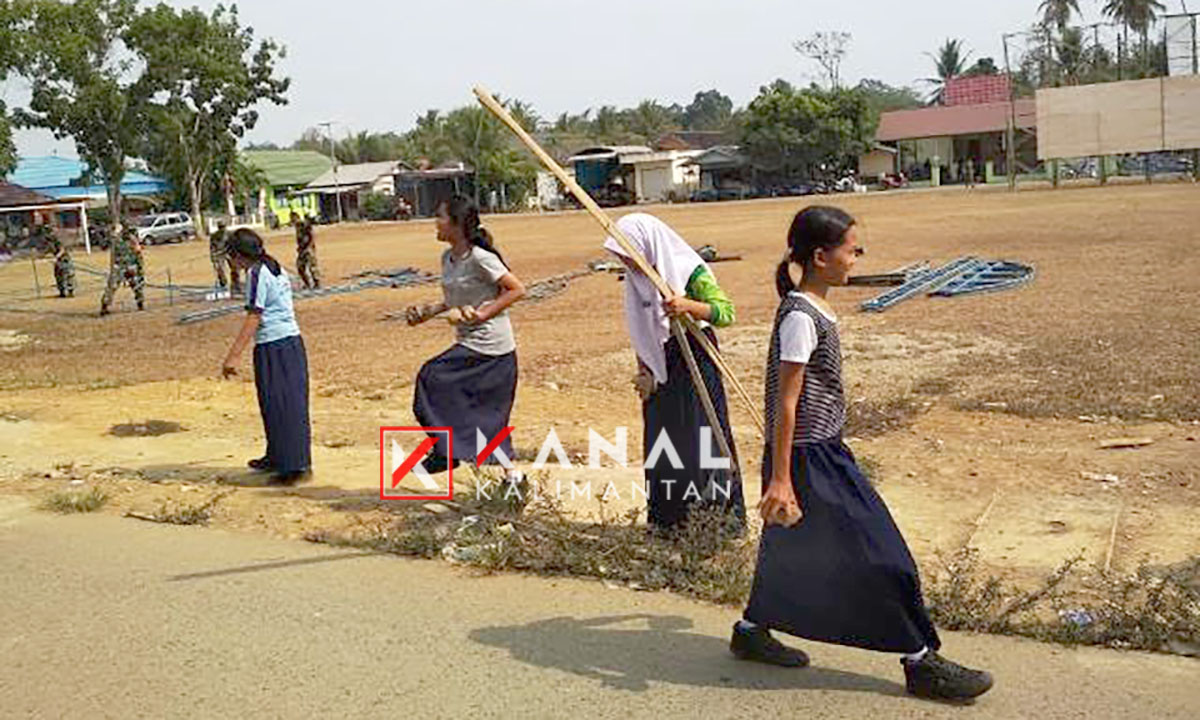 Siswa SD-SMP Bantu Bersihkan Lapangan untuk Pembukaan TMMD 106 Binuang Santang