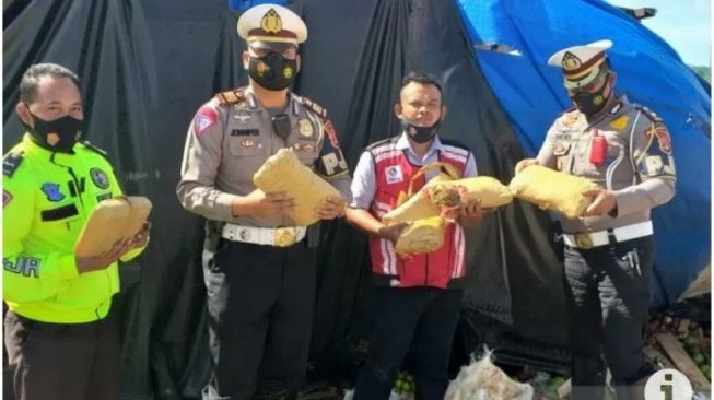 Ganja tersebut sudah diserahkan ke Polres Lampung Selatan, sedang sopir dan kernet mobil tersebut masih dalam perawatan di rumah sakit. (antara/suara.com)