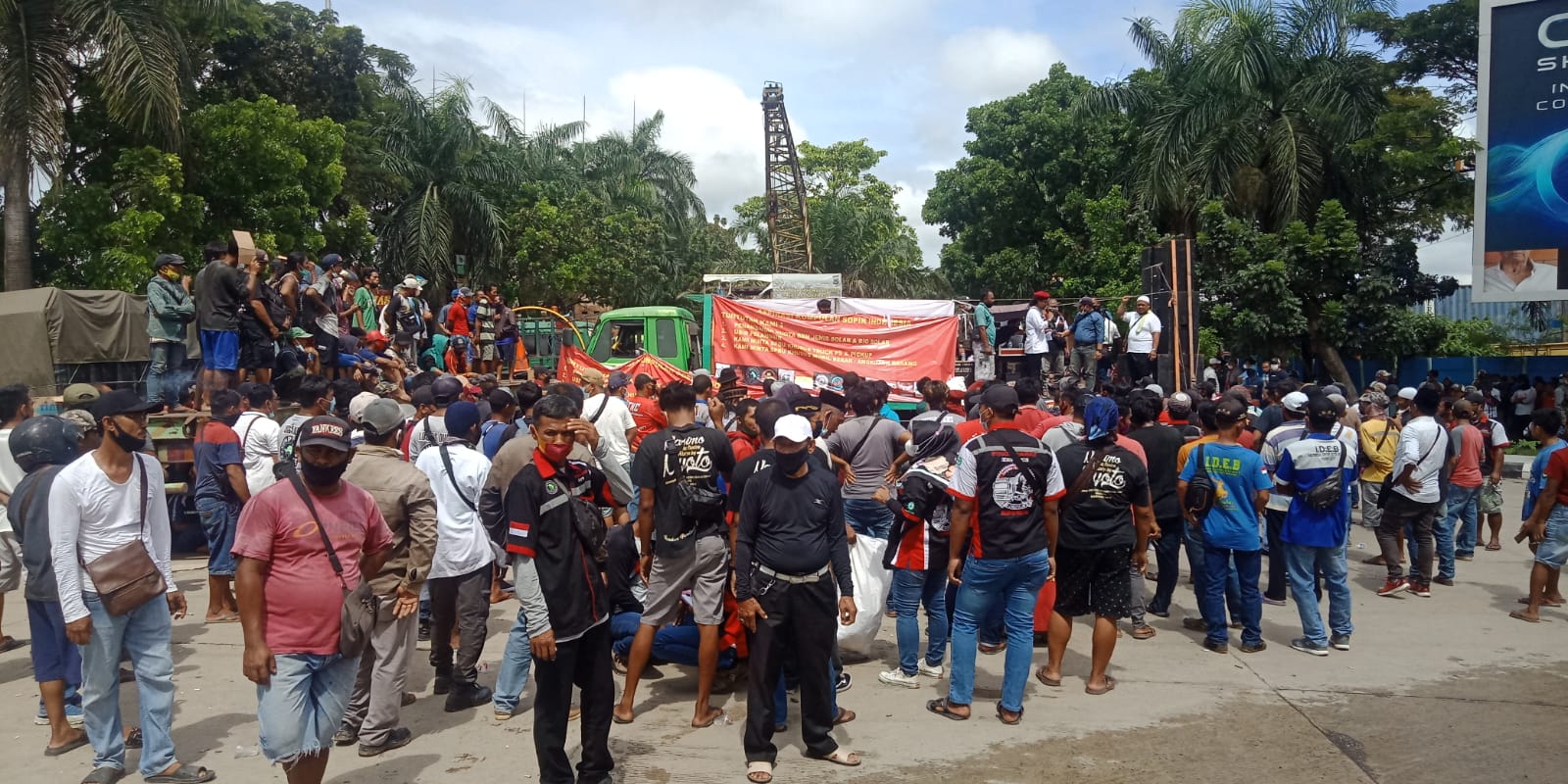 Aksi unjuk rasa para sopir dan buruh menuntut penambahan kuota BBM bio solar, usir para pelangsir, adanya SPBU khusus truk PS dan pikap dan SPBU khusus mobil besar angkutan barang.