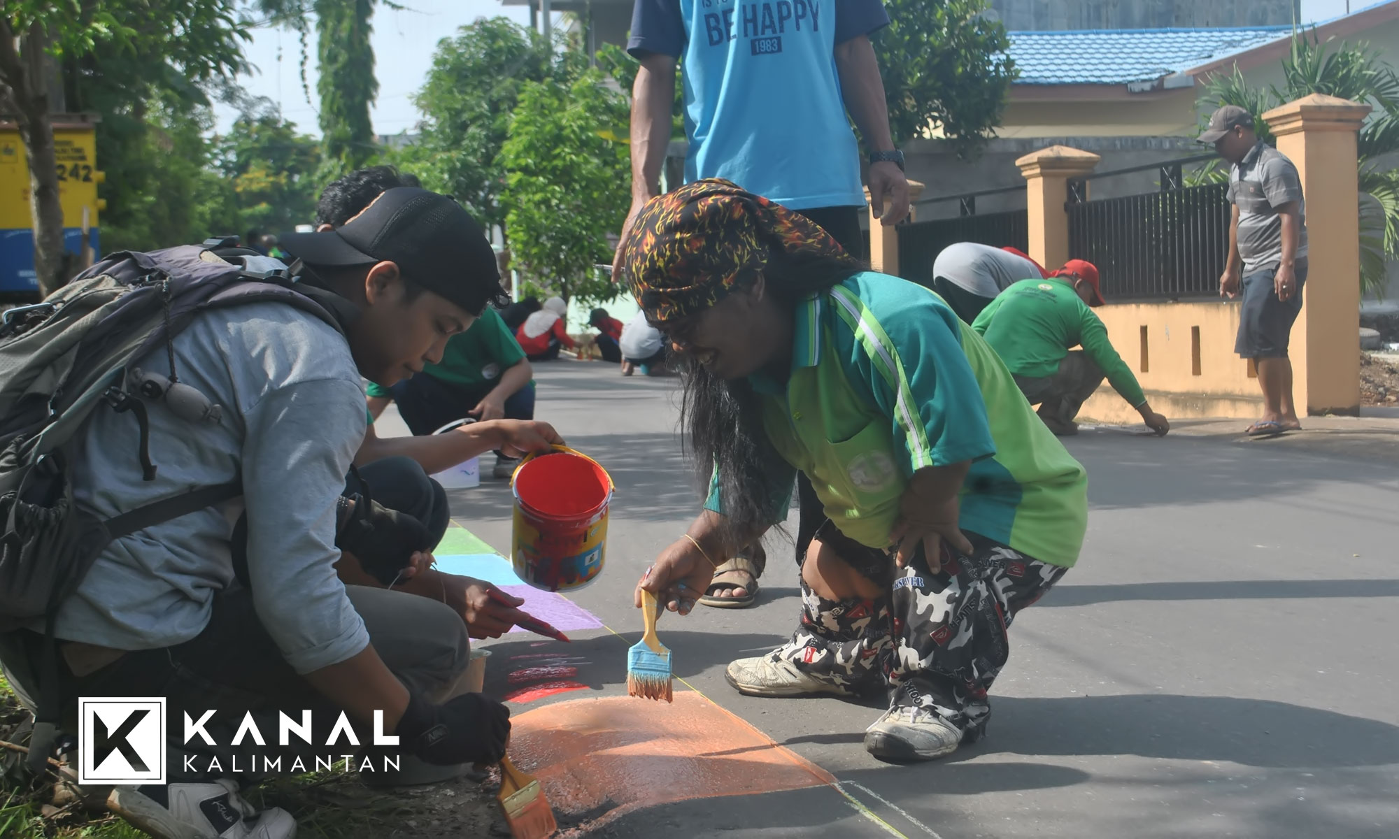 BANJARBARU, Forum Komunitas Hijau Banjarbaru ST 12 (Serbu Tanam 12) membantu warga Jalan Pinus II Kelurahan Komet, Kecamatan Banjarbaru Utara mencat jalan dengan warna-warni pelangi, Sabtu (4/11).