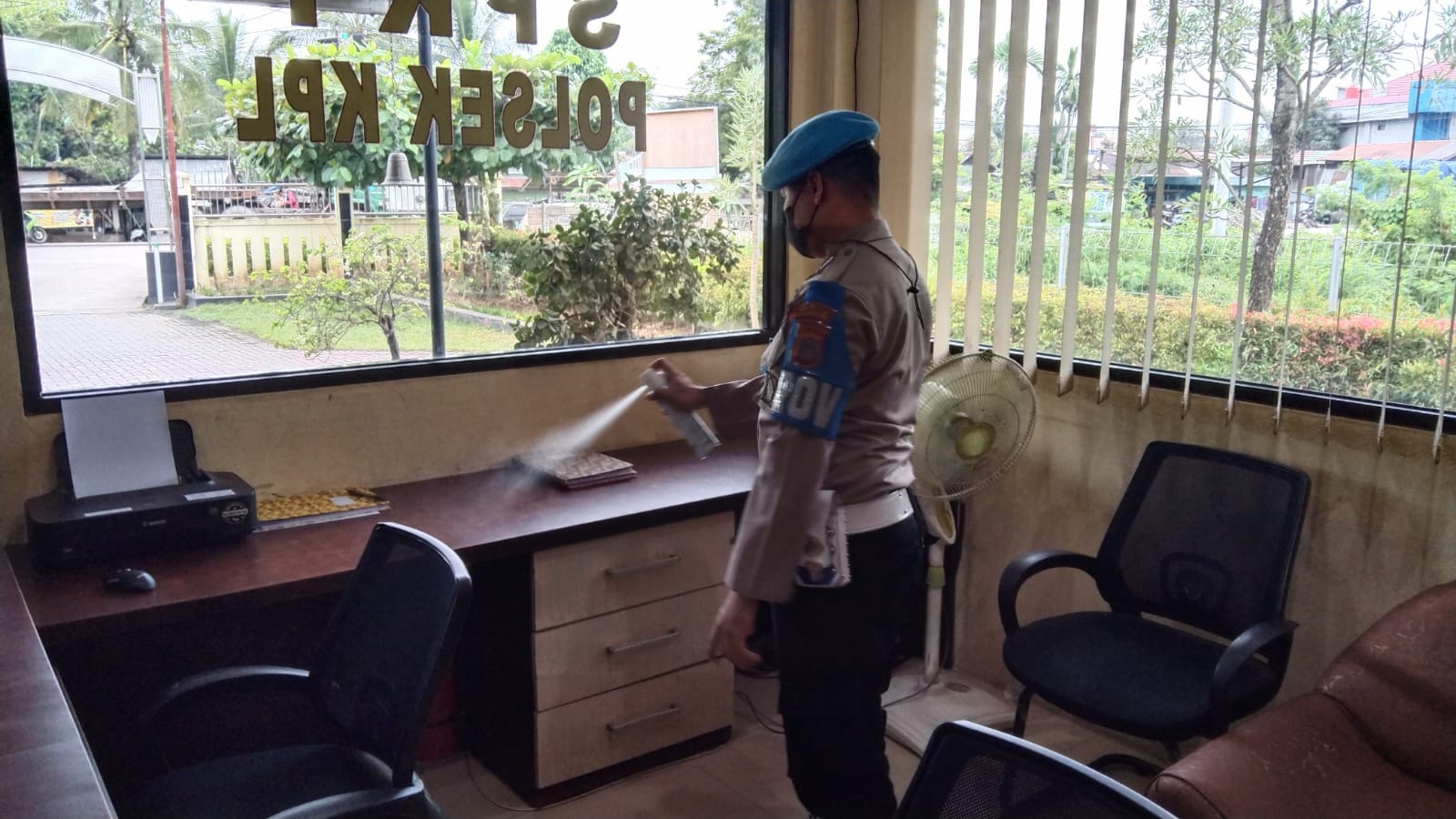 Penyemprotan dilakukan mulai dari halaman Mapolresta Banjarmasin dan di masing-masing ruang kerja.