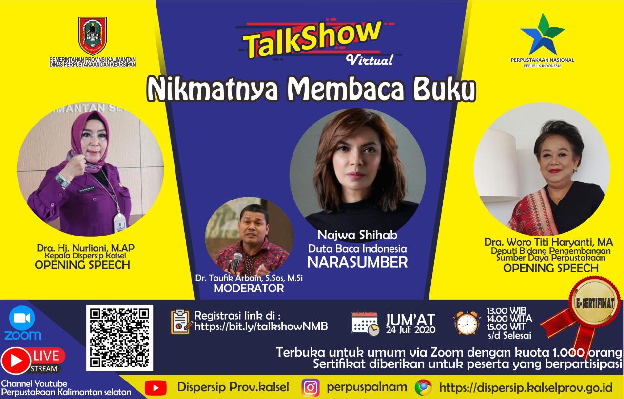 Kepala Dispersip Kalsel Dra Hj Nurliani Dardie mengatakan, acara dengan mengusung tema “Nikmatnya Membaca Buku” buah dari kerjasama antara Dispersip Kalsel dengan Perpustakaan Nasional RI. Dipilihnya talkshow secara virtual, lantaran andemi Covid-19 yang masih melanda Kalsel.