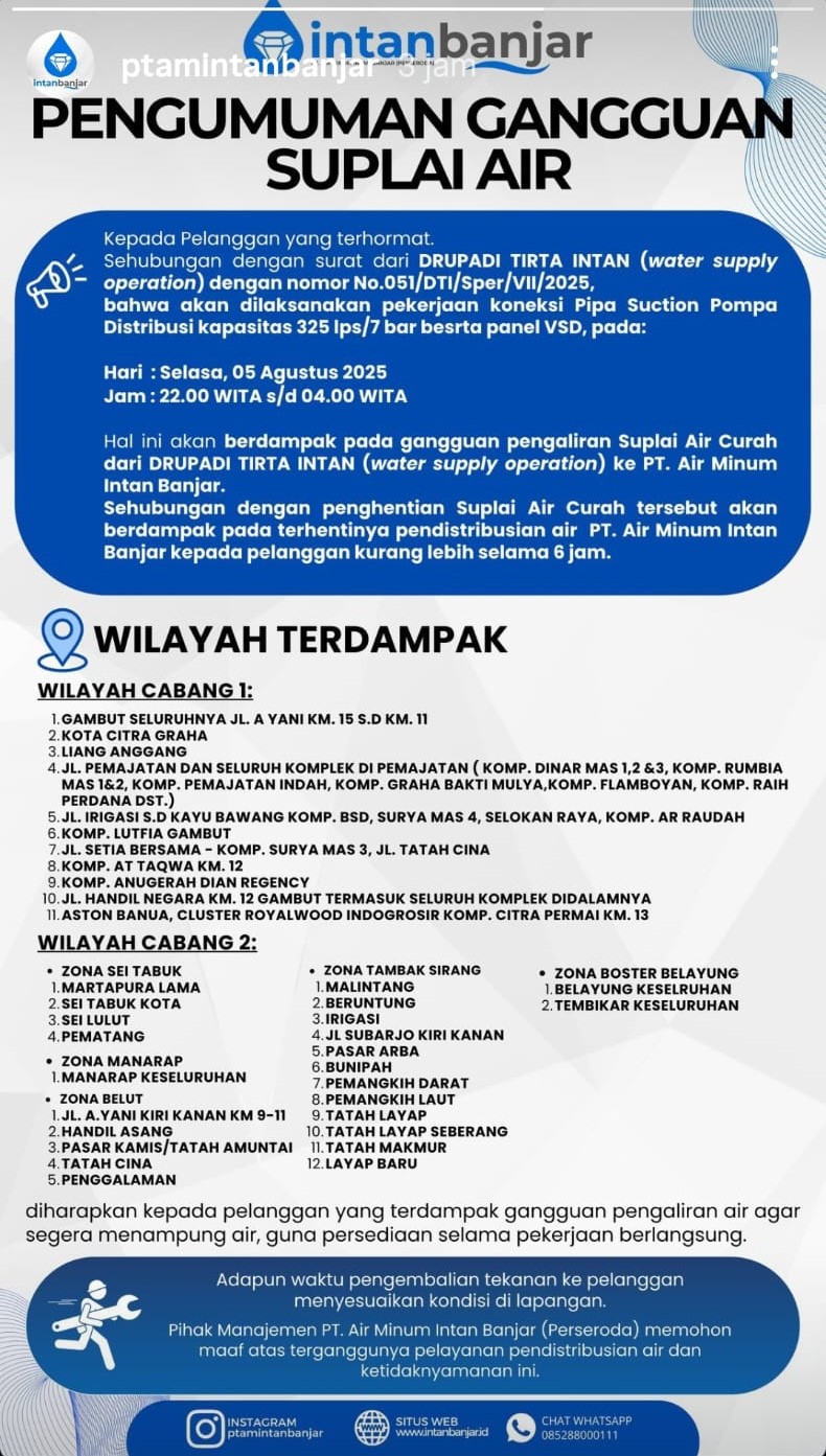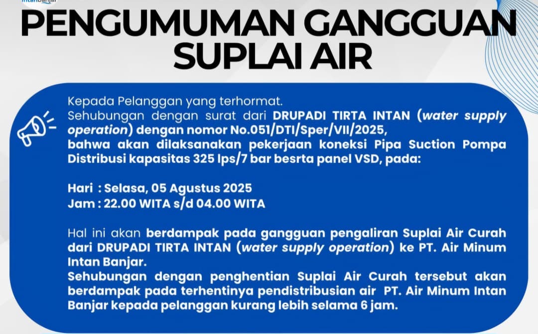 Suplai air ke PT Air Minum (PTAM) Intan Banjar akan terganggu selama kurang lebih 6 jam pada Selasa (5/8/2025) mulai pukul 22.00 Wita hingga 04.00 Wita.