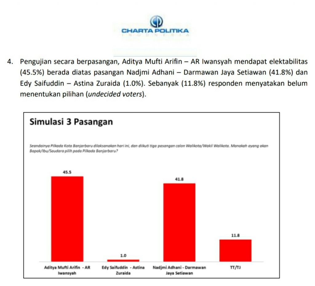 Sedangkan pada pengujian secara berpasangan, Aditya Mufti Arifin – AR Iwansyah mendapat elektabilitas (45.5%). Ini berada di atas pasangan Nadjmi Adhani – Darmawan Jaya Setiawan yang memperoleh (41.8%) dan Edy Saifuddin – Astina Zuraida dengan angka (1.0%). Sementara sebanyak (11.8%) responden menyatakan belum menentukan pilihan (undecided voters).