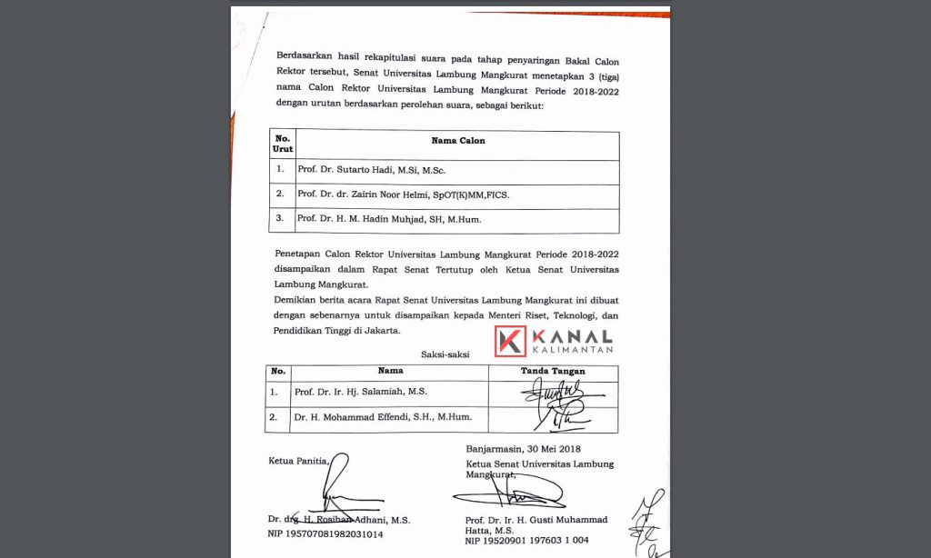 Berdasarkan dari hasil rekapitulasi suara tahap penyaringan, maka Senat Universitas akhirnya menetapkan tiga nama untuk diajukan ke Kemenristekdikti. Tiga nama tersebut, sesuai peringkat adalah 1) Prof Dr Sutarto Hadi M.si, Msc, 2) Prof Dr Zarin Noor Helmi SpOT(k)MM, FICS dan terakhir 3) Prof Dr HM Hadin Muhjad SH, M.Hum. Sedangkan Prof Dr Husaini SKM, M.Kes hanya meraih 1 suara tidak diajukan alias terpental dari bursa calon rektor.