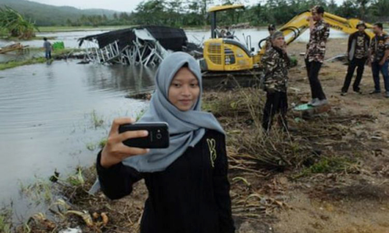 Seorang perempuan muda mengambil swafoto di lokasi bencana tsunami, di Banten. Foto : The Guardian