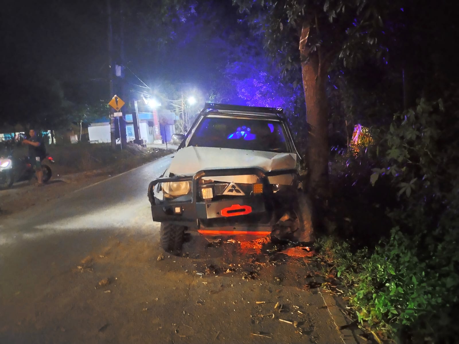 Mobil double cabin yang Triton yang dikemudikan RAS terhenti setelah menabrak pohon, Sabtu (16/7/2022) malam. Foto: polresbanjar