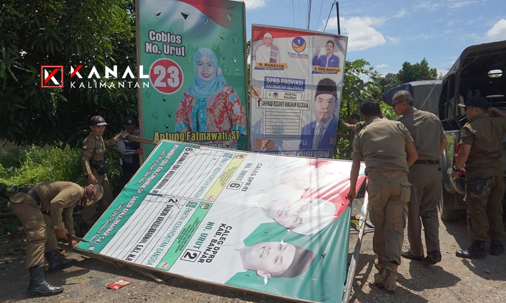 MARTAPURA, Atas dasar pertimbangkan keselamatan Bawaslu Banjar dengan dibantu Satpol PP Banjar, tidak menurunkan Alat Peraga Kampanye (APK) caleg yang terpampang di papan-papan besar berbayar di sepanjang jalan A Yani Kabupaten Banjar.