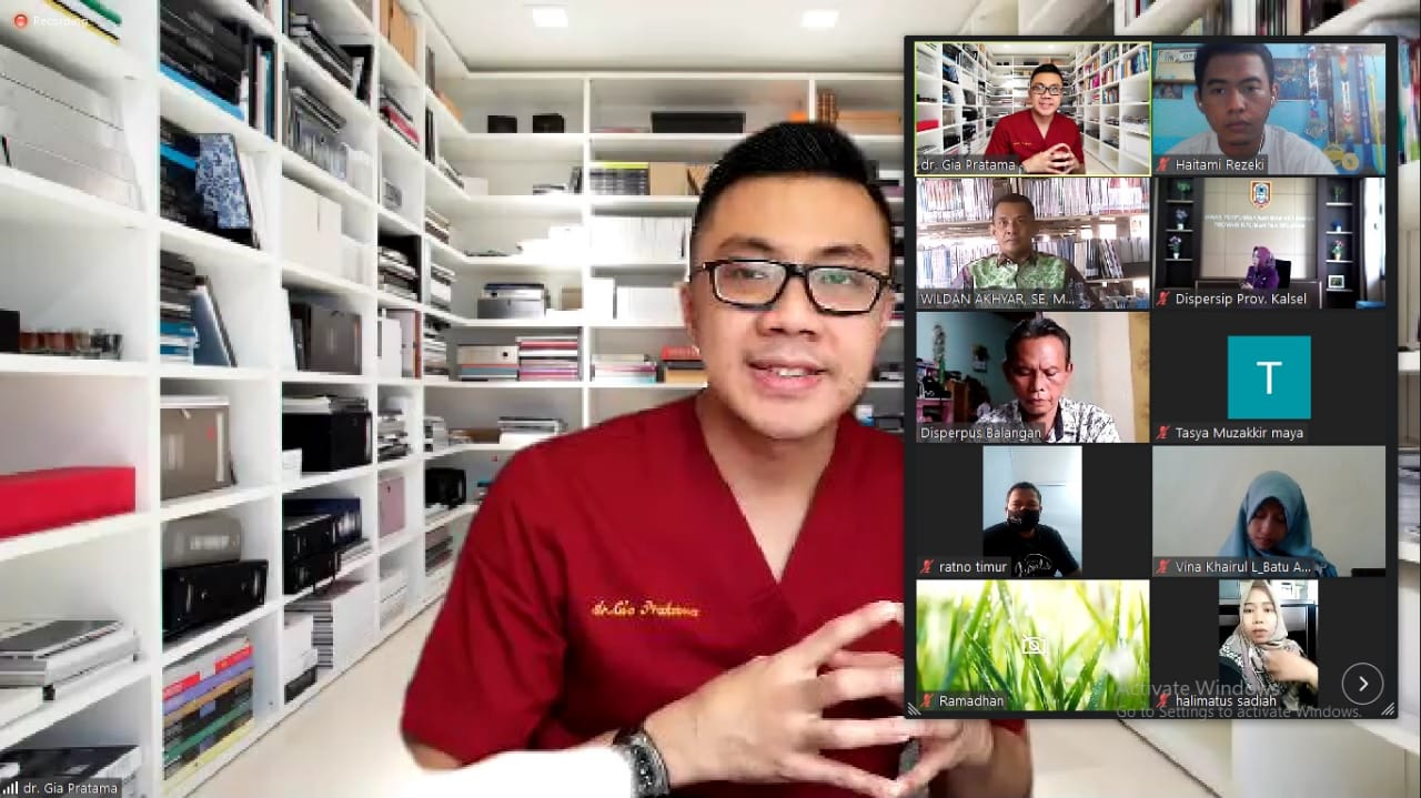 “Hari ini Dispersip Kalsel berperan mempromosikan preventif dan promotif terhadap Pandemi Covid-19 melalui daring dengan menghadirkan dr. Gia Pratama yang bergelut di bidang kesehatan sekaligus penulis buku,” kata Bunda Nunung, sapaan akrabnya.