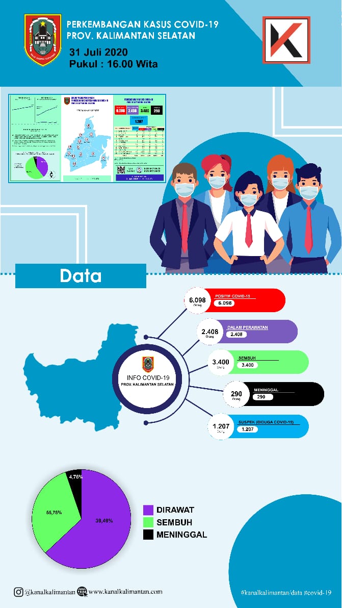 KANALKALIMANTAN.COM, BANJARBARU – Kabar mengejutkan datang dari Gugus Tugas Percepatan Penanganan (GTPP) Covid-19 Kalsel. Data terbaru yang dirilis pada Jumat (31/7/2020) sore mencatat, jumlah kasus positif Covid-19 mencapai 6.096 kasus.