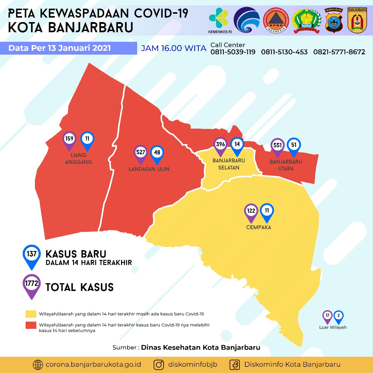 Satuan Tugas (Satgas) Covid-19 Kota Banjarbaru mencatat penambahan kasus baru virus corona, sebanyak 17 kasus, pada Rabu (13/1/2021). Bahkan, jika diakumulasikan dengan jumlah kasus selama 14 hari terakhir, tren kenaikan kasus Covid-19 telah mencapai ratusan.