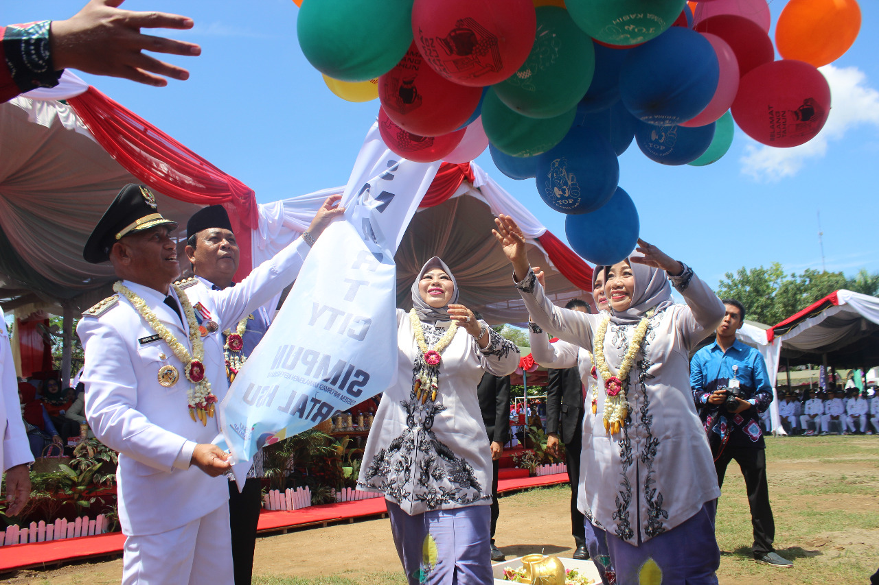 AMUNTAI, Puncak Peringatan Hari Jadi ke-67 Kabupaten Hulu Sungai Utara (HSU) tahun 2019 dengan mengangkat tema ‘Bagawi Behimat, Hasil Babarkat, HSU Mantap’ yang dipusatkan di Lapangan Pahlawan Amuntai, Selasa (30/4), berlangsung meriah. Acara dihadiri Gubernur Kalsel H. Sahbirin Noor bersama Ketua Tim Penggerak PKK Provinsi Kalsel Hj Raudatul Jannah, Ketua DPRD Provinsi Kalsel, serta Bupati/Walikota se- Kalsel.