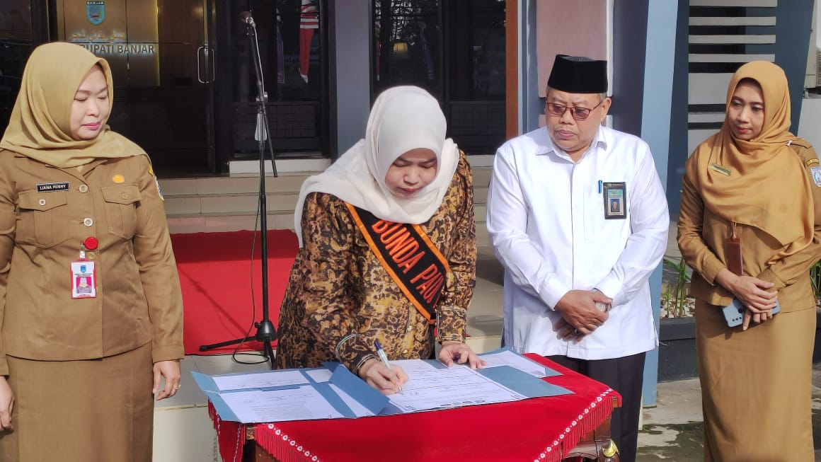 KANALKALIMANTAN.COM, MARTAPURA – Penandatanganan Komitmen Bersama dan Surat Edaran Bersama Bunda PAUD dengan Kepala Kementrian Agama dan Kepala Dinas Pendidikan Kabupaten Banjar tentang Gerakan Transisi Pendidikan Anak Usia Dini/Raudhatul Athfal ke Sekolah Dasar/Madrasah Ibtidayah yang menyenangkan dilaksanakan Senin (10/7/2023).