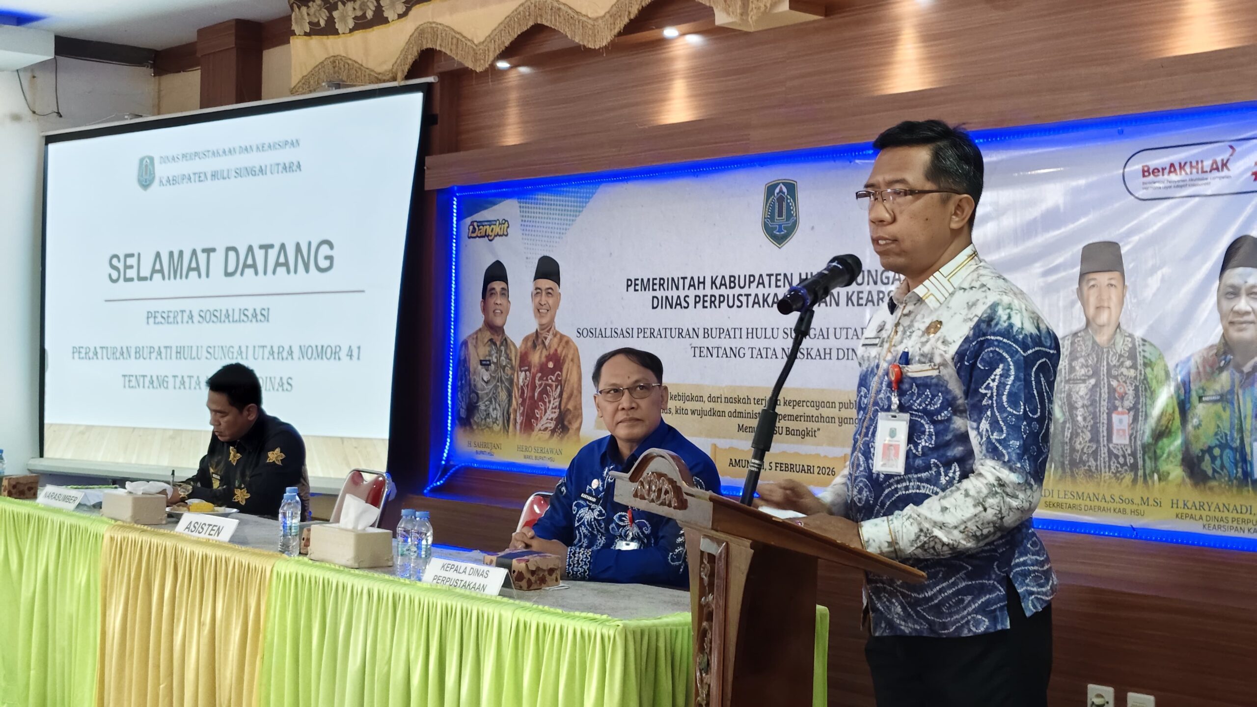 “Ditetapkannya Peraturan Bupati Hulu Sungai Utara Nomor 41 tahun 2025 bertujuan untuk mewujudkan keseragaman, ketertiban, dan kepastian dalam penyusunan naskah dinas di lingkungan Pemerintah Kabupaten Hulu Sungai Utara,” ujarnya saat membuka sosialisasi Peraturan Bupati Hulu Sungai Utara Nomor 41 tahun 2025 tentang Tata Naskah Dinas, di aula Dispersip HSU, Kamis (5/2/2026).