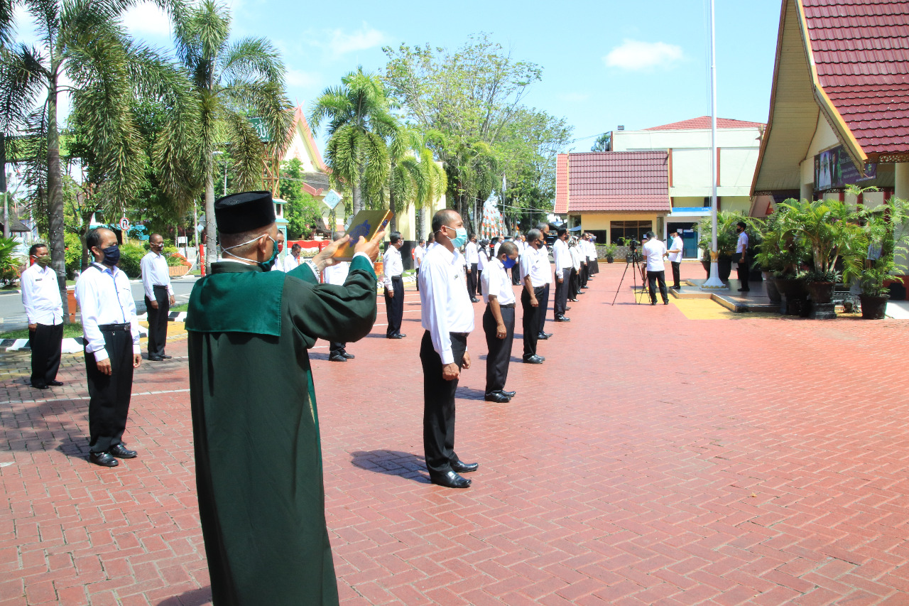Dengan tetap melaksanakan protokol kesehatan Covid-19, salah satunya penerapan social distancing dan physical distancing, pelantikan di halaman kantor Bupati HSU, Rabu (10/6/2020) itu terdiri dari Pejabat Adiministrator sebanyak 5 orang, Pejabat Pengawas/eselon IV sebanyak 1 orang, 11 orang Kepala Sekolah SMP, dan 29 orang kepala Sekolah Dasar Sehingga total keseluruhan bebanyak 46 orang.