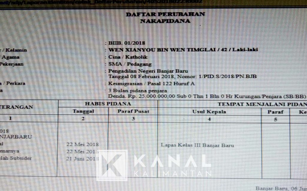 Dodi Karnida, Kepala Divisi Kemigrasian Kemenkumham Kalsel mengatakan, Pengadilan Negeri Banjarbaru memutuskan hukuman itu pada hari Kamis (8/2) karena yang bersangkutan terbukti secara sah dan meyakinkan bersalah melakukan tindak pidana.