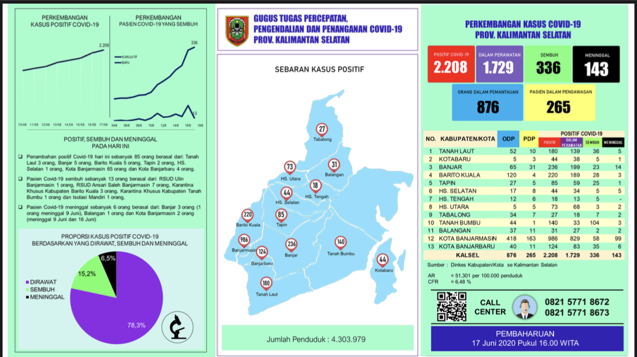 “Penambahan kasus positif Covid-19 hari ini sebanyak 85 orang,” kata Juru Bicara Tim Gugus Tugas Percepatan Penanganan (P2) Covid-19 Kalsel Muhamad Muslim, Rabu (17/6/2020) sore.