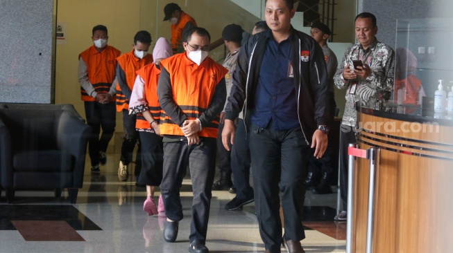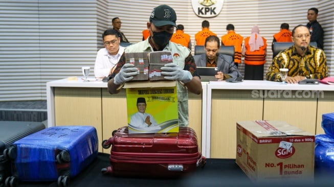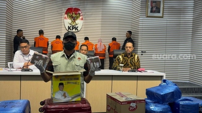 Para tersangka OTT KPK di Kalsel yang dihadirkan saat konferensi pers, Selasa (8/10/2024) sore. Foto: Suara.com