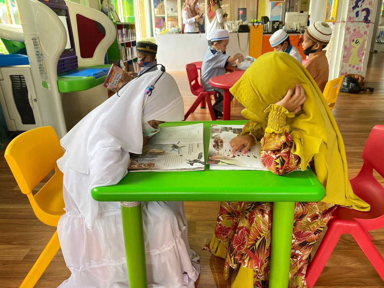 Kids Library di Jalan A Yani Km 6 Banjarmasin ini menjadi pilihan guru dan anak karena memiliki fasilitas yang dilengkapi wahana bermain ramah anak.