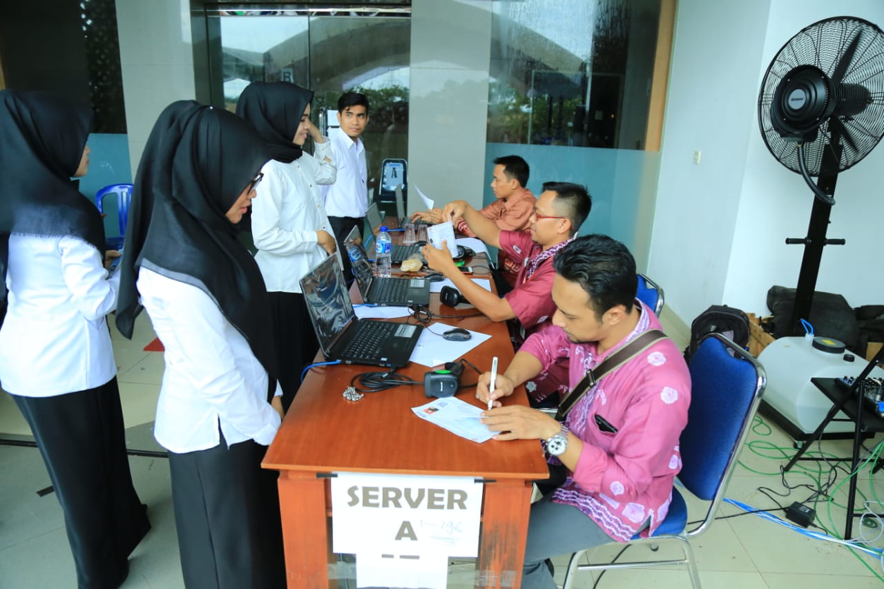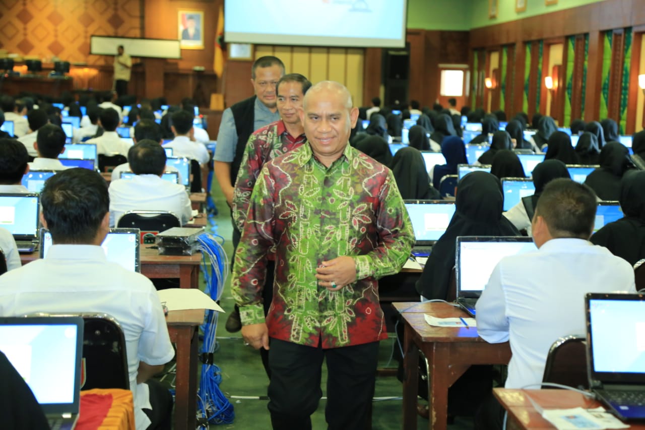 Bupati HSU H Abdul Wahid HK bersama dengan Sekda HSU M Taufik hadir langsung meninjau lokasi tes seleksi awal menggunakan CAT. Bupati HSU sempat memberikan arahan dan semangat kepada para peserta untuk mengikuti tes dengan sebaik-baiknya.