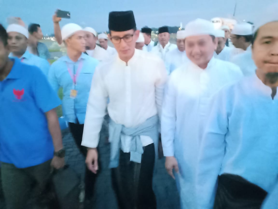 Disisi lain, Sandiaga Uno yang berbaju koko berwarna putih dan dan bercelana sarung tersebut menunjukan wajah riangnya saat disambut para relawan pendukungnya.