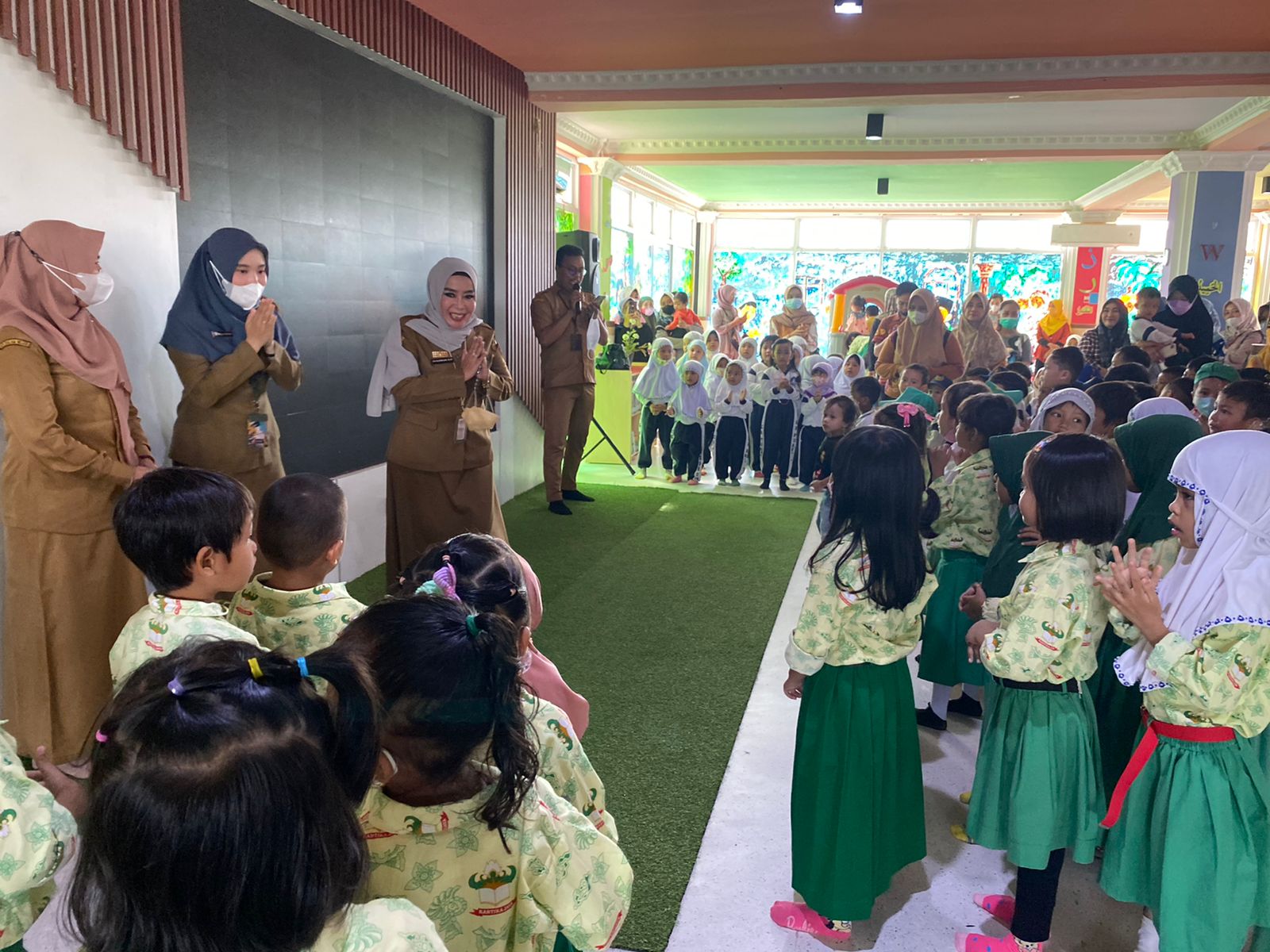 Datang pada waktu bersamaan, tiga lembaga pendidikan anak usia dini memenuhi ruang perpustakaan khusus anak itu. Mereka diajak untuk mendengarkan cerita dongeng, bermain, dan bernyanyi bersama.