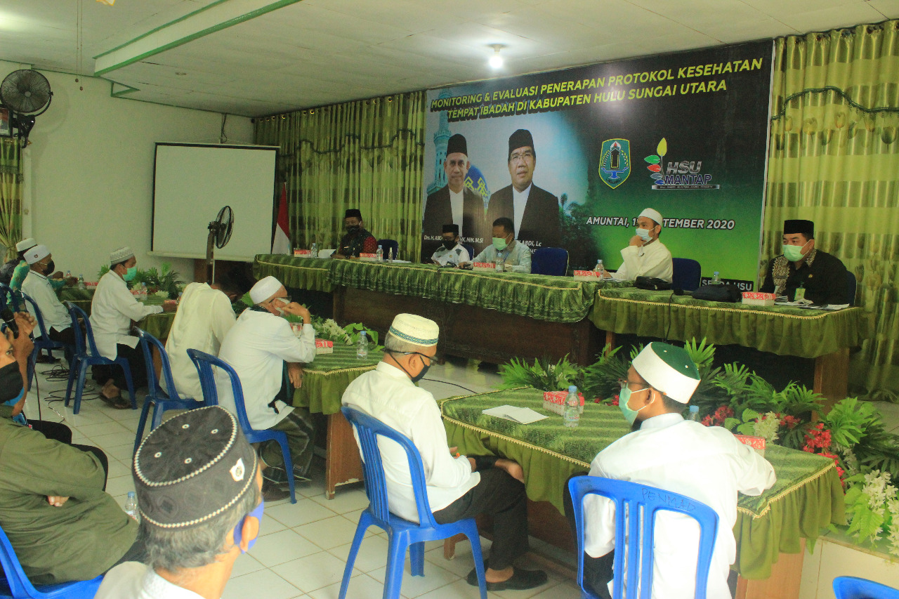 Kedatangan Tim Monitoring Kalsel yang terdiri dari Gugus Tugas Provinsi Kalsel, Dinkes, Bidang Fatwa MUI Kalsel dan Kakanwil Kemenag Kalsel ini, disambut Kepala Kantor Kemenag HSU H Yusran, Kepala BPBD HSU Sugeng Riyadi, Kabag Kesra HSU, MUI HSU dan para Pengurus Mesjid se Kabupaten HSU, Jumat (18/09/2020) di Aula KanKemenag Kabupaten HSU.