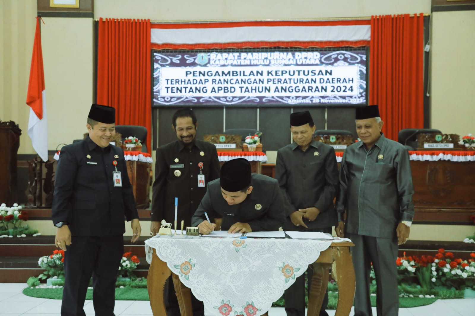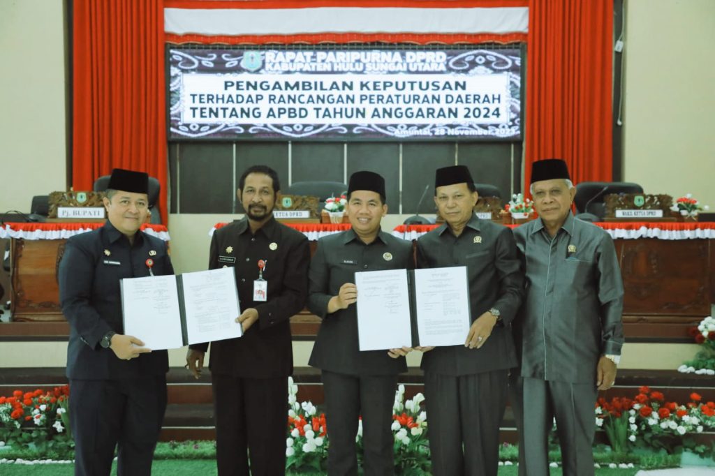 Kesepakatan itu diambil dalam rapat paripurna DPRD HSU dengan agenda pengambilan keputusan persetujuan bersama atas diajukannya Raperda APBD tahun 2024, di gedung DPRD Kabupaten HSU, Selasa (28/11/2023) siang.