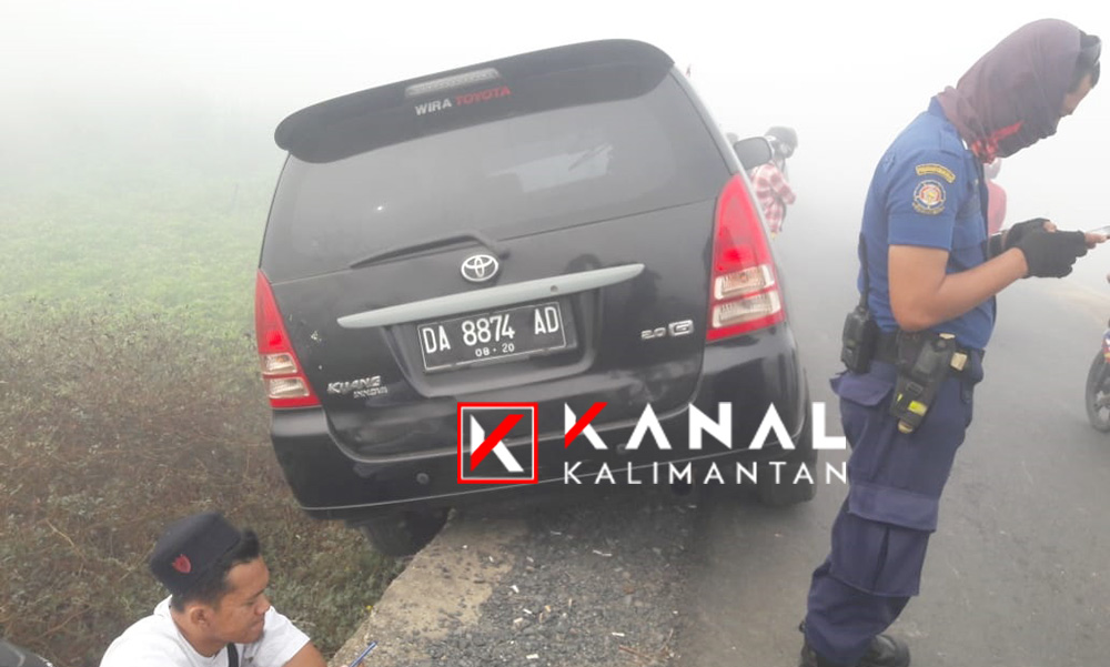 MARTAPURA, Akibat jarak pandang (visibility) yang sangat terbatas, sebuah mobil minibus, nyungsep setengah badan ke bahu jalan di desa Tungkaran, Kecamatan Martapura, Kabupaten Banjar, Sabtu (14/9) pagi.