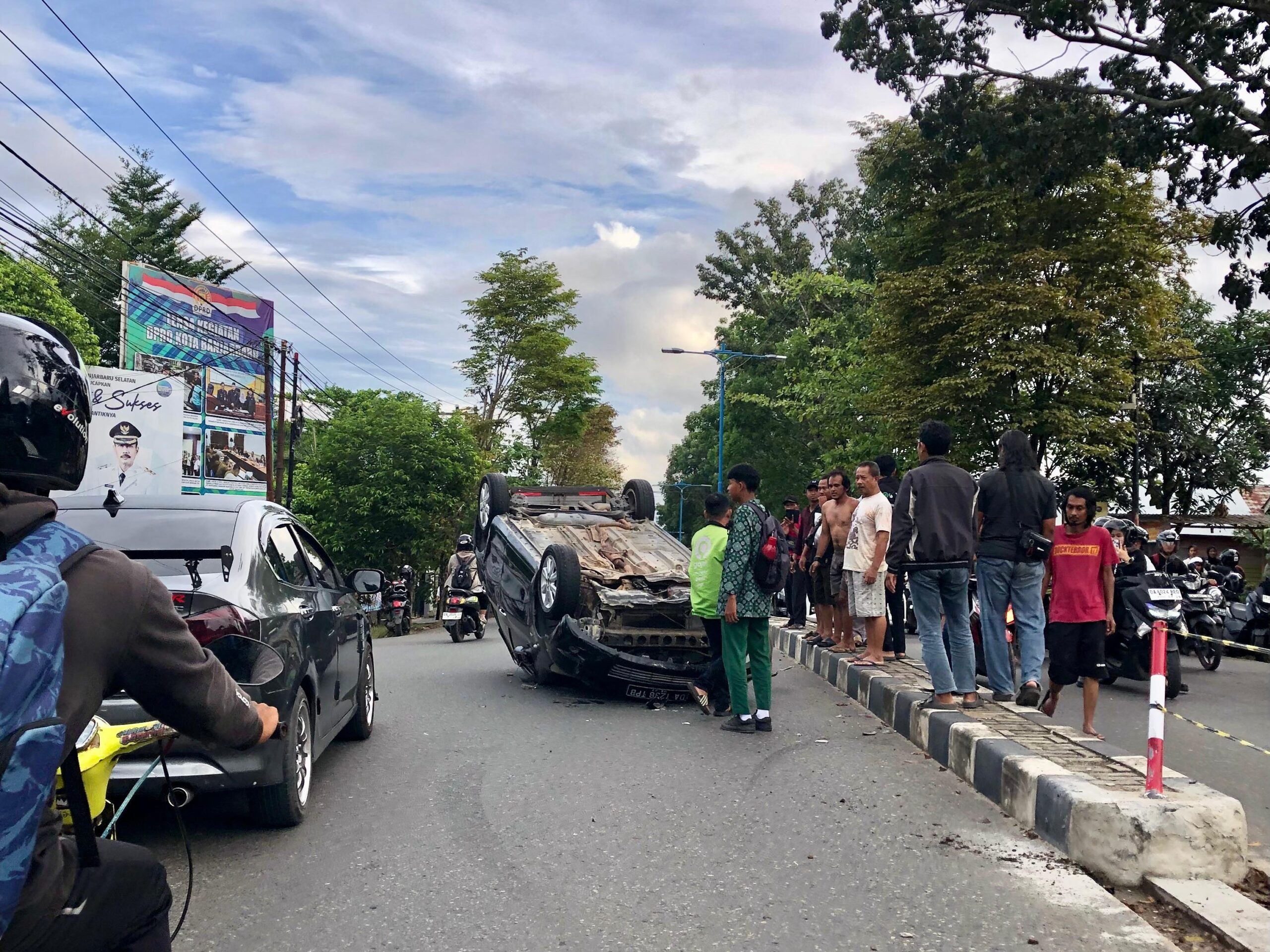 Setelah menabrak trotoar katanya, mobil yang dikendarai dengan kecepatan tinggi itu terlihat terguling dua kali.