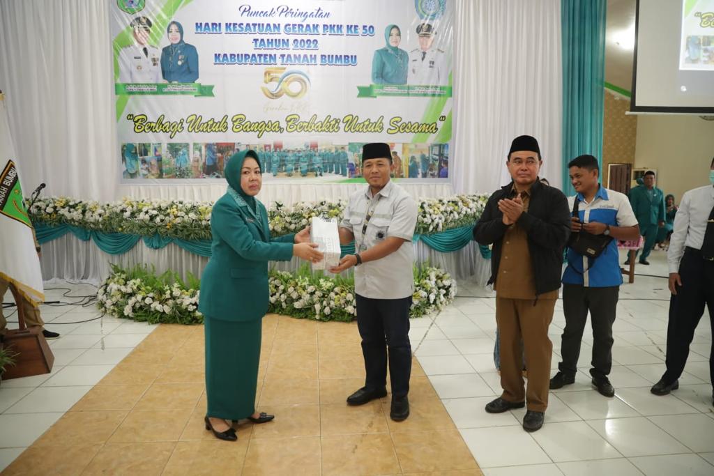 Ketua TP PKK Tanbu menerima bantuan alat ukur kesehatan dari PT Arutmin Indonesia Tambang Batulicin & Satui berupa bantuan susu balita dari PT Kalbe, serta doorprize dari Bank Kalsel dalam memeriahkan lomba TP PKK.